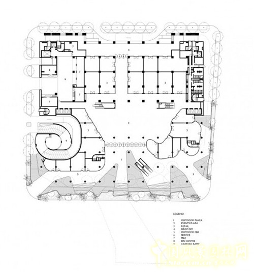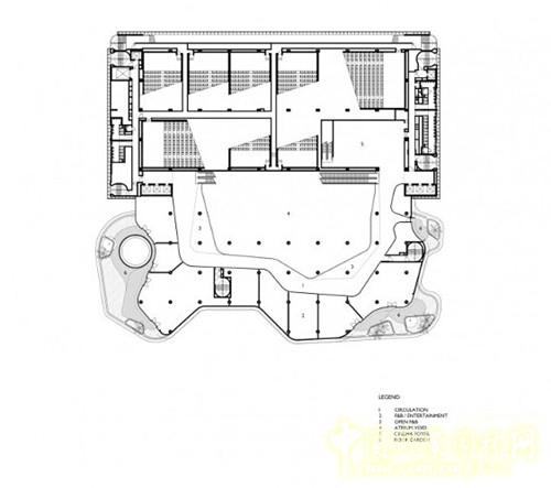 內(nèi)部中央空間分為三個主要部分來設(shè)計,第一層的空間與周邊街道形成路網(wǎng),方便行人進(jìn)入。第二層的空間與人行天橋相連,跨越道路,在綜合體與附近的建筑之間建立通道。負(fù)責(zé)來分開空間的是一個城市廣場,高出街道20米,設(shè)置餐廳、酒吧、電影院等。第三主要空間是屋頂劇場和娛樂活動區(qū)域,蔥郁的植被覆蓋露天平臺,屋頂中央有一個玻璃天窗,通過天窗可以看到中庭,在中庭里有可以看到植被的屋頂,使空間顯得更為開敞。