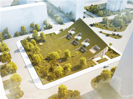 Rastvor Group事務所設想了一個“山形幼兒園”,整個建筑的屋頂和地面的綠色空間合為一體,傾斜的屋頂結構是這座建筑最大的特色,它是屋頂和地面的界限變的模糊,傾斜的屋頂陽臺可以為幼兒園的教室?guī)砀嗟年柟狻?