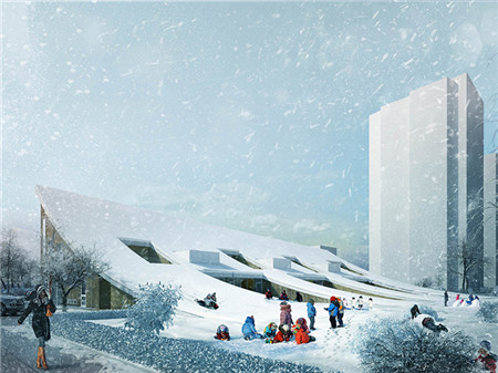 屋頂與地面合二為一的傾斜幼兒園
