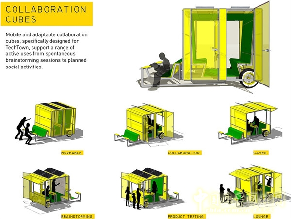 互動小屋:這些專門為科技城設計的可移動、可調節的互動小屋,可應用于多種多樣的活動,如自發的頭腦風暴或是計劃周全的社交活動。