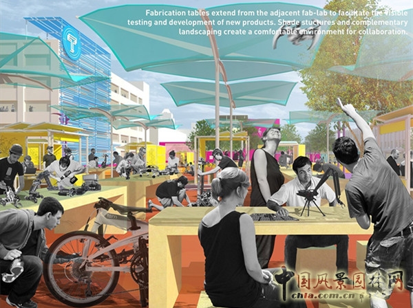 木質的桌椅方便了人們在此對新產品進行觀測與試驗,遮陽的結構與周圍的景觀也為人們創造了一個交流合作的舒適環境。