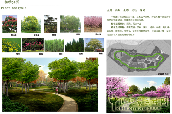 植物配置原則:1、豐富植物品種,強調植物多樣性原則,維護生態平衡;2=自然配置,突出山林野趣;3、保護現狀植物,封山育林,增加森林郁蔽度,使整個公園成為天然綠色氧吧;4、根據現狀植被情況、景點布局、園路規劃情況,植物設計分區進行,突出景觀節點、公園入口區、主要園路沿線植被景觀,豐富景觀層次。