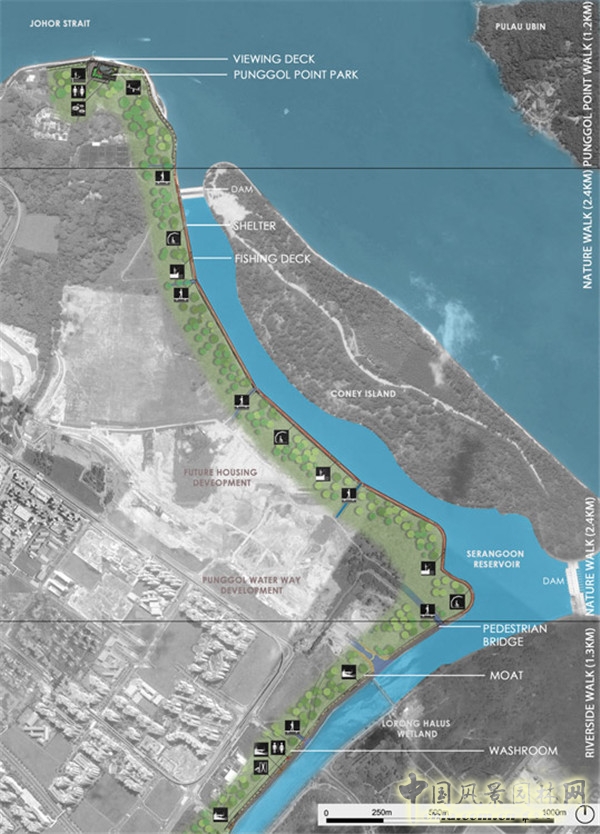 中國(guó)風(fēng)景園林網(wǎng)訊 榜鵝位于新加坡東北部,是新加坡政府規(guī)劃中最新的“濱水而立”的濱水市鎮(zhèn)。榜鵝濱水步道則位于大片城市景觀之中,游客置身于此,可以感受時(shí)空交錯(cuò)、詩(shī)情畫意般的美景。逝去的時(shí)光在景觀之中重現(xiàn),而現(xiàn)實(shí)又在這一懷想過(guò)去的過(guò)程中被賦予了新的含義。人們?cè)谶@里可完全沉浸于個(gè)人空間之中,與自然和諧共生。