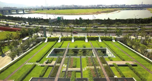 受光寶集團委托,SWA為其在臺北市的總部基地進行景觀設計,場地的總占地面積為10152平方米。整體的設計概念是在斜坡量體上方修建一座25層高的大樓(theTower)。在斜坡量體處建造了觀光花園、綠色屋頂等景觀,同時斜坡上的草坪還能起到蓄水的作用。在設計意象上,借著斜坡量體及斜坡上高、中、低三處水景的設計,將建筑物與河的關系一層一層建立起來,形成統一的景觀。三處水景的設計是企圖借著水景由高處往低處流的連結關系,與基隆河相互呼應,并通過景觀設計將斜坡花園與下方庭院連成整體。在斜坡上種植各類四季草花及基地的四周種植數排濃密的樟樹,提供了都市中難得的空間體驗。