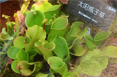 太陽瓶子草(Heliamphora tatei),為瓶子草科卷瓶子草屬多年生草本植物,本屬植物主要分布于南美洲的巴西、委內瑞拉和圭亞那,共有約10種。雖然身為食蟲植物,但它本身并不能像瓶子草、豬籠草、茅膏菜等其它食蟲植物那樣具有自身能分泌消化酶的能力,太陽瓶子草只能通過存積在漏斗狀葉中的液體淹死動物,再依靠液體中含有的消化細菌來分解尸體獲得營養。它們的捕蟲器是由葉片卷曲融合成的一個簡單的瓶狀結構演化而來。本屬植物為南美洲高降雨量地區特有的,因瓶蓋不發達無法擋住雨水,為了防止捕蟲瓶中的液體過多而使其倒伏,它在基部上方的葉片融合處進化出了一條細小的縫隙,可讓過多的雨水流出。從太陽瓶子草捕食和消化的方式可以看出,它是一種比較低等和原始的食蟲植物,可能正處于進化為真正的食蟲植物的過程當中。
