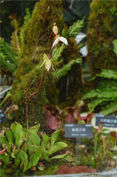 近日,珍奇植物館食蟲植物展柜內一株罕見的太陽瓶子草開花了,高高挺出的花葶上有3朵花,其中兩朵已經盛開,潔白輕盈的花朵向下俯垂,仿佛嬌羞的少女不敢抬頭迎接周圍游客注視的目光。