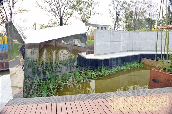 入園后有一條浮桶體驗棧道,是全園的亮點之一。走上棧橋,人會帶動浮桶棧道上下起伏變化,水中倒影形成的“虛幻景園”也會隨之面目全非、七零八碎。這處景觀大有深意,它表示人類對自然的干預(yù)越大,就會得到越慘痛的教訓(xùn)。往棧道東側(cè)看去,那里有一道青磚景墻,其背后散落著一些植物群落,代表著自然環(huán)境。人類與自然越親近,植物與人類的距離就會越近。