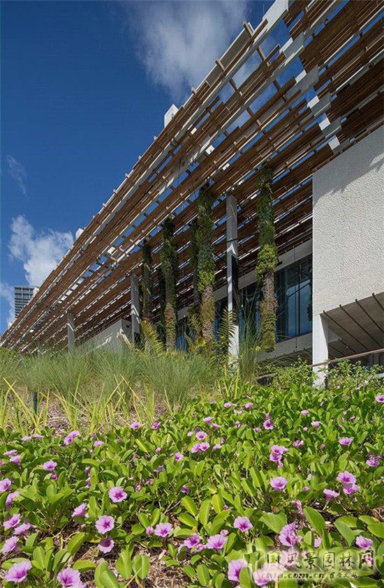 南佛羅里達(dá)的經(jīng)典攀爬植物裝飾建筑外墻,與建筑堅硬的邊緣形成了鮮明的對比,同時又為當(dāng)?shù)匾吧参锾峁┝艘粋€棲息地,以顯示建立生態(tài)系統(tǒng)對于公共環(huán)境營造的重要性。