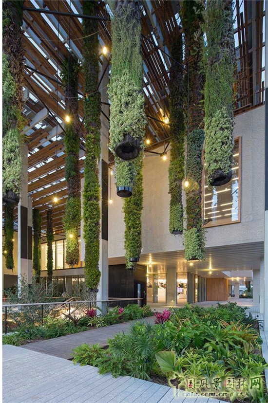 在博物館入口處上方,木板組成的頂棚,下面懸掛繁茂的耐陰植物。花園是通過再循環(huán)利用的水進(jìn)行灌溉的,植物通常選擇抗逆性強(qiáng)的,可以抵抗鹽堿性的空間。