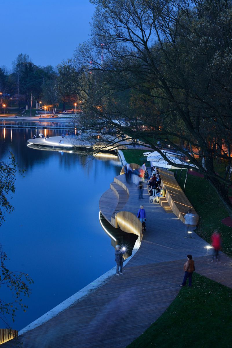 建筑師注意使用自然的材料來(lái)強(qiáng)調(diào)該地區(qū)的自然屬性。局部使用了特殊形狀的鋪裝和人造草坪。在走廊區(qū)域,建筑師使用質(zhì)地較軟的木材。其他硬化的地面,如自行車停車場(chǎng)和健身區(qū),則使用礦物合成和EPDM顆粒的透水面材。走廊懸挑至湖面上方的部分使用的是錨固在深入湖底的混凝土墩子上的鋼梁。整個(gè)場(chǎng)所的照明使用的是低能耗的LED燈。