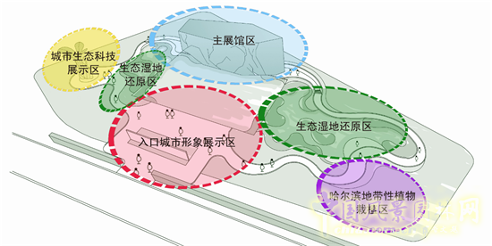 園區(qū)由入口城市形象展區(qū)、生態(tài)濕地展區(qū)、主展館區(qū)和生態(tài)科技展區(qū)、哈爾濱地帶性樾的栽植區(qū)五個部分組成,其中,城市形象展示區(qū)利用哈爾濱最具代表性的建筑、建設(shè)材料來展示哈爾濱獨有的城市風(fēng)采;生態(tài)濕地區(qū)則是通過環(huán)境來塑造生態(tài)的哈爾濱環(huán)境;主展館區(qū)利用浮冰造型的建筑形式通過視和觸覺向參觀者傳遞一個不一樣的哈爾濱;城市生態(tài)科技展示區(qū)通過丁香花瓣的造型結(jié)合用聲、光、電等科技手段,展示科技哈爾濱的未來;哈爾濱地帶性植物栽植區(qū)是利用哈爾濱的常用的植物品種來展現(xiàn)哈爾濱的園林特色。