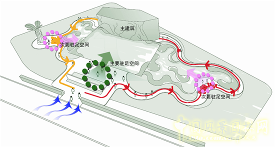 園區(qū)內(nèi)由一條主環(huán)路貫穿整個空間環(huán)境,參觀者隨著道路的延伸穿過城市濕地、融冰建筑、丁香花廣場,避免重復(fù)性參觀。