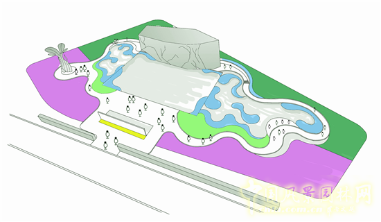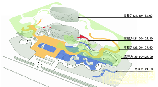 園區內相對平坦,為避免參觀者疲勞性的觀賞,設計在場地上做了相應的豎向處理,使主體建筑地面底于場地空間,目的是利用自然的地理環境使建筑內部環境溫度下降,形成清涼空間感受。