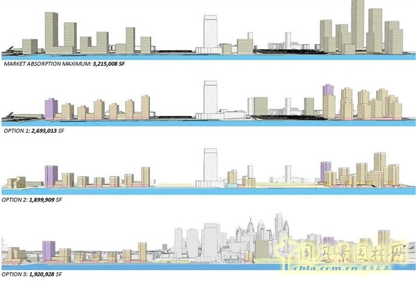 該規(guī)劃在市場(chǎng)吸收參數(shù)范圍內(nèi)嘗試并建立了不同的發(fā)展密度方案,因此,不論是市場(chǎng)情況如何,該場(chǎng)地的設(shè)計(jì)均能靈活適應(yīng)其變化。根據(jù)規(guī)劃,通行區(qū)域、停車(chē)場(chǎng)、建筑及觀景和開(kāi)放平臺(tái)等都均衡地分布于場(chǎng)地內(nèi)。