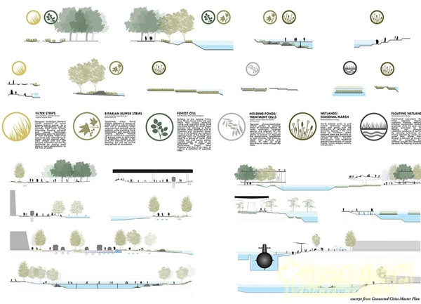 通過獨特的水處理設計,各種暴雨的流入激活了城市。結合水處理和生境創建,分支系統將水傳輸、過濾、儲存,最終排回三一河分洪河道