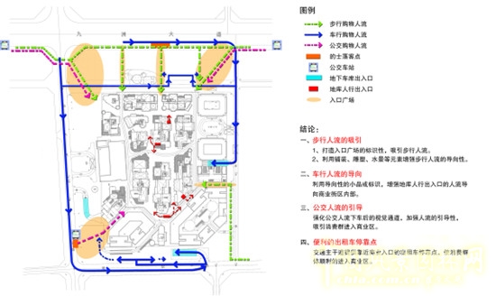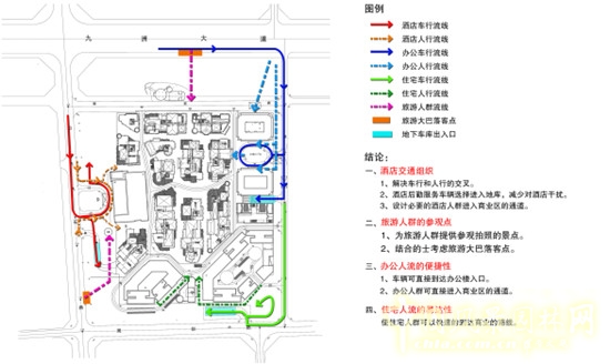 項(xiàng)目作為大型商業(yè)綜合體,功能涵蓋商業(yè)、辦公、住宅、旅游、酒店等,如何合理有序地的組織交通流線,使各功能區(qū)完美契合是項(xiàng)目設(shè)計(jì)的關(guān)鍵。針對(duì)不同的景觀使用功能和人的動(dòng)線進(jìn)行分析,以增強(qiáng)導(dǎo)向性為重點(diǎn)。