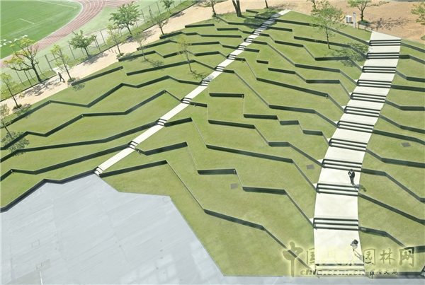 委托人不希望在這里加入太多的設計,于是設計師利用一個奇妙的想法,在原有的斜坡上,運用美麗的不規則線條設計了梯田景觀。場地被樹木的陰影覆蓋著,一條道路被設置為彎曲的折線,通往最下面的足球場。讓人們無論在那個視角都能感受到令人驚嘆的景觀。