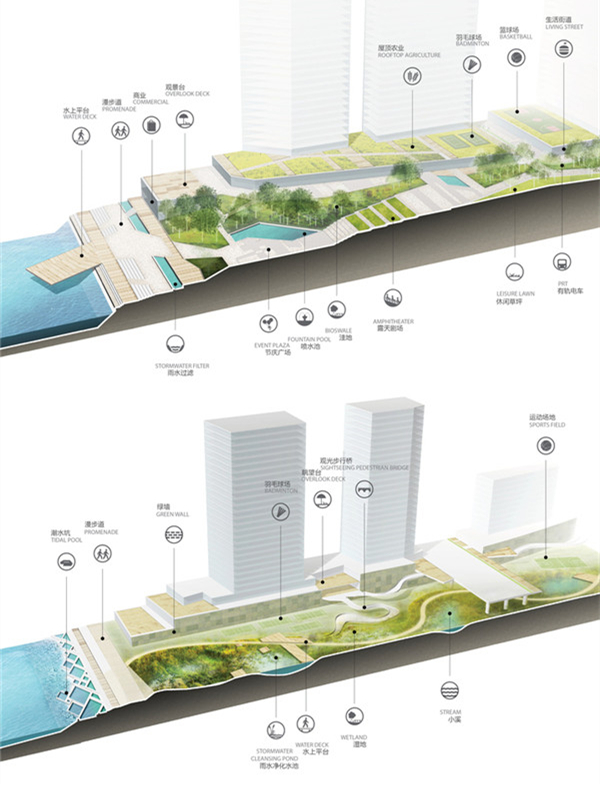 在整個開發(fā)園區(qū)所連接到的公共領(lǐng)域中,有一個位于基礎(chǔ)設(shè)施平臺臺頂部的“屋頂互聯(lián)網(wǎng)絡(luò)公園和花園”,這創(chuàng)建了全球最大的綠色屋頂系統(tǒng)。除此之外,裙樓也將提供自然生態(tài)環(huán)境,這里能夠過濾掉雨水,并提供休閑活動場所,不會受到汽車的干擾影響。在多樣化的交通系統(tǒng)中優(yōu)先考慮了人行道的布局,交通中心位于人口密集的城市中心。