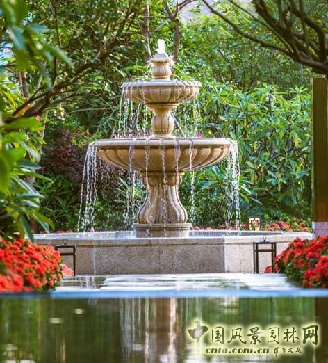 尤其是在庭院里往銷售區(qū)后場的亭臺樓閣和疊水望去,猶如高山流水,鳥語花香;潺潺流水延伸至與庭院相連接的三角綠地,整個空間抽象成高山、瀑布、小溪、疊石、林木、芬芳…設(shè)計靈感源于傳統(tǒng)文化中的山水畫:群峰矗立之間,飛湍激流,行至水窮處,便是一掛飛瀑,濺起千堆碎玉。山水大勢間,有亭翼然,其間有客三人,二者把酒問青天,一人撫琴高山流水。