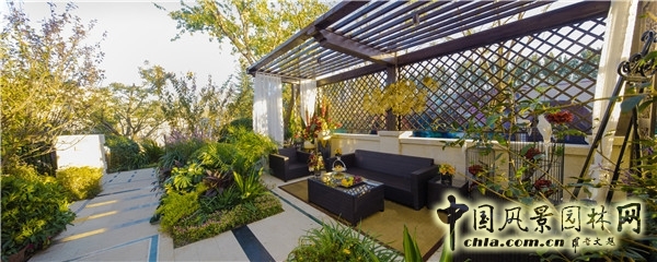下疊庭院入口位置重要,結合新古典建筑線腳關系,尋求設計靈感。采用橫向拉槽方式構筑里面裝飾,借助豎向疊水增加其動感,最終打造端莊大氣不失靈動的庭院入口小空間。上疊面積僅為33㎡,空間較小,僅可作為一個入戶禮儀性空間展示。盡管如此,依然放置了一個木制廊架,圍合出一小塊休憩區域,作為主人休閑使用。