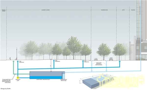 該項(xiàng)目中采用了多種綠色設(shè)施,包括雨水收集系統(tǒng)、2.5公頃的透水層面鋪裝等。項(xiàng)目中的一個(gè)容量為一百萬加侖的蓄水池可將所有空間中的降雨收集再利用,用于整個(gè)新公園的灌溉。
