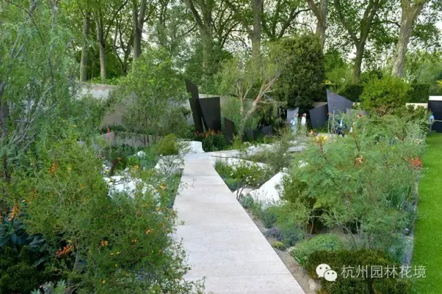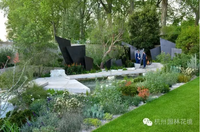 獲得金獎的花園并非都是色彩的喧泄,往往注重追溯古今,再現自然。如地質花園(The Telegraph Garden)在同一尺度長方形地塊,通過富有創意的幾何圖案園路和銅質造型山脈,將空間分隔變幻,從茂密山林到半干旱溫帶植物群落,展示地質演變中植物的適應性。香草園(L’ Occitane Garden)是歐舒丹品牌公司贊助,紀念當年創始人在一條廢棄的古老河流周邊種植香草植物并提煉香精油,但由于薰衣草類尚未到盛花期,缺少色彩,只能用一些矢車菊、亞麻類植物替代,花園整體難免顯得有些荒涼。