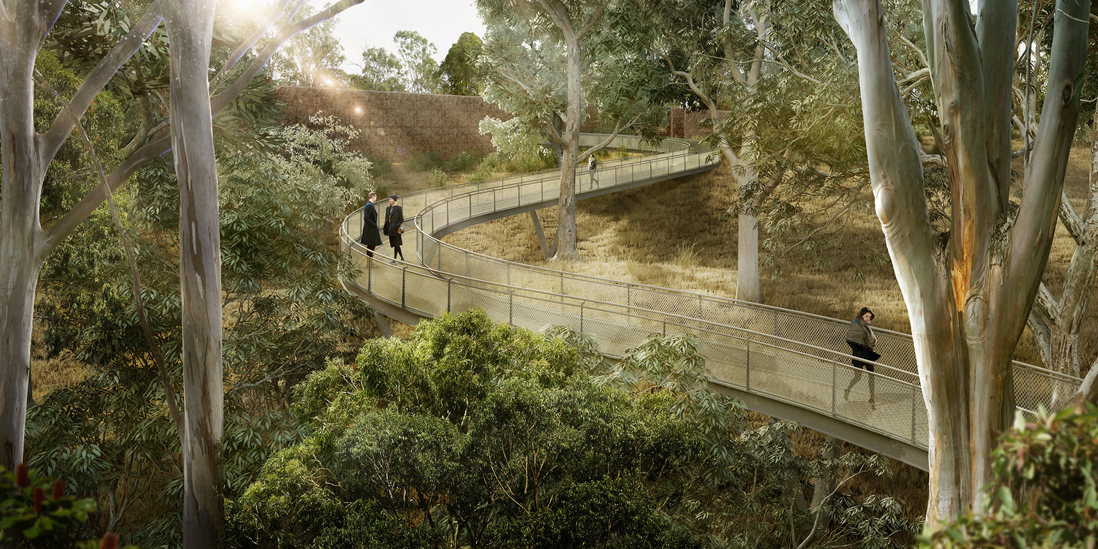 CHROFIandMcGregorCoxall將阿卡迪亞追思園(AcadiaRemembranceSanctuary)稱作“一座為世俗社會設計的原始林地公墓”。建筑師將這個墓地放置在位于悉尼(Sydney)郊區(qū)的一個如同田園詩般的保護區(qū)林地。這個項目的目的是建成一個沒有墓碑的天然墓地,人們將通過GPS技術找到親人和愛人的安息點。這個創(chuàng)意將墓地設計的重點,從整齊劃一的小塊墓地和墓碑,轉移到對于叢林生態(tài)系統(tǒng)的保留和保護上去。這個新建的墓地坐落在10.1公頃的開闊草地上,它的中心是一座400平方米的建筑。