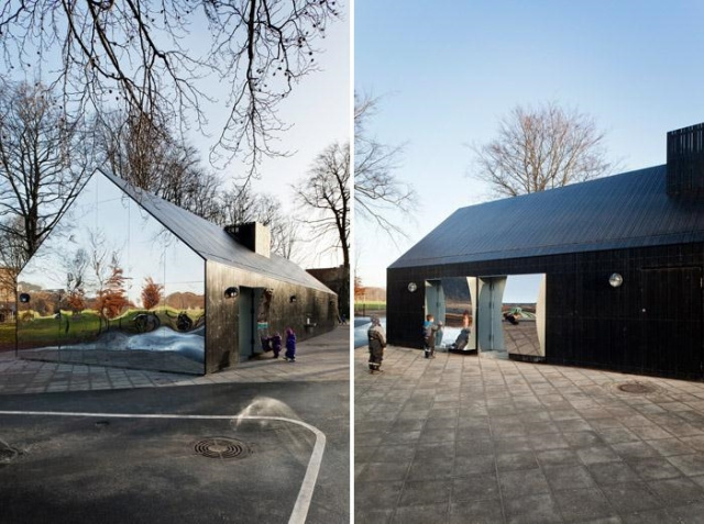 Mirror House位于哥本哈根市,是為一個曾受涂鴉困擾的互動游樂場所建立的公共設施建筑。建筑的山墻以及門背都裝有鏡面,反射帶來了有趣的視角,讓古板封閉的山墻變成“鏡之墻”,并創造了建筑與景觀之間巧妙的過度,反映出園內的環境和活動。背面的彎曲鏡面,白天開啟時,這些哈哈鏡讓孩子們愛不釋手,夜晚關閉之后,建筑表面簡潔統一。