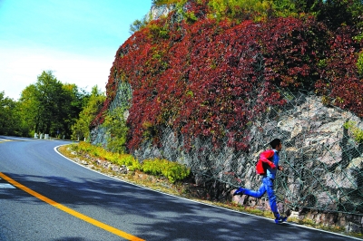 位于延慶區大莊科鄉的昌赤路兩側大面積的爬山虎泛紅,把公路兩側裝點得如詩如畫。(攝影賈德勇)