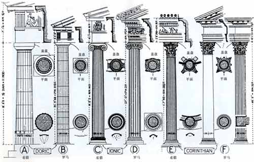 此外,羅馬人還把古希臘柱式發展為五種:即多立克柱式、塔司干柱式、愛奧尼克柱式、科林斯柱式和組合柱式,并創造了券柱式。
