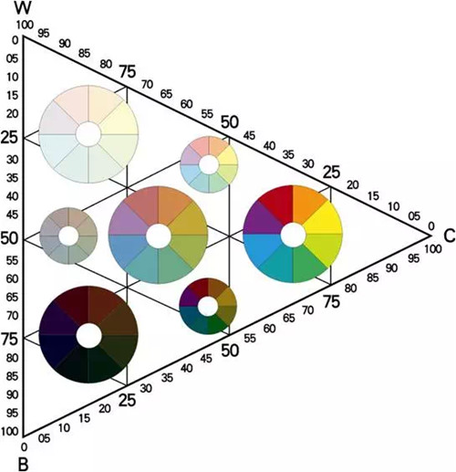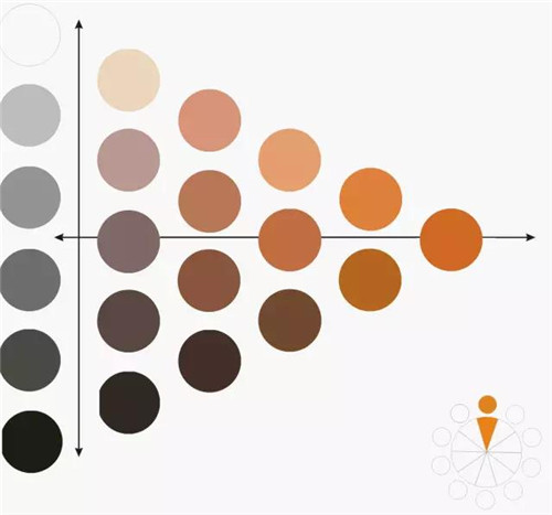 以橙色加黑白為例,產生不同明度、彩度的色域變化