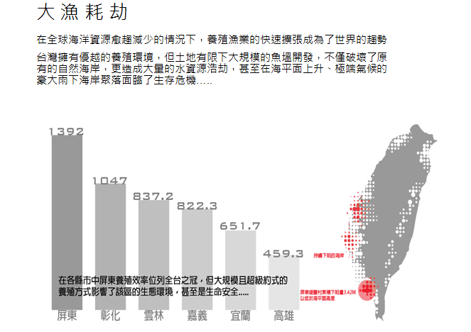 從生態(tài)面可以看到基地從從前的多樣性的農(nóng)漁共生的生活方式,在為了追求經(jīng)濟(jì)下的轉(zhuǎn)變而改成單一化的養(yǎng)殖,這樣的產(chǎn)業(yè)雖然造就了非常多的工業(yè)期的機(jī)會(huì),卻也因?yàn)樵诋a(chǎn)業(yè)鏈下扮演的最初級(jí)的角色而受到了最高的風(fēng)險(xiǎn)。像是當(dāng)遇到海旱的時(shí)候可以整個(gè)魚塭的魚都會(huì)死掉,或者是在面臨水災(zāi)的時(shí)候整個(gè)魚塭里面的魚都會(huì)跑掉,這些養(yǎng)殖場(chǎng)造成這么大的風(fēng)險(xiǎn)。