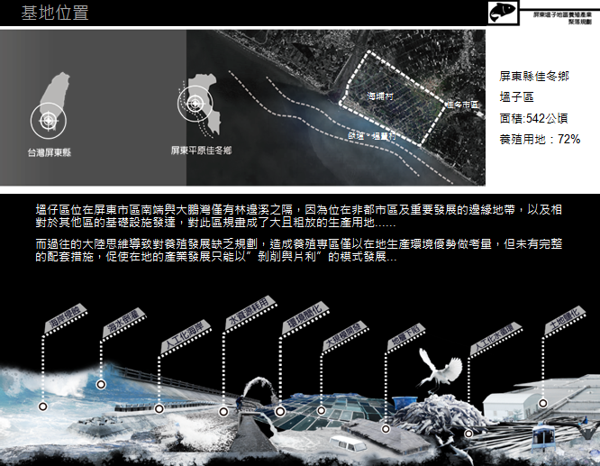 再看到臺(tái)灣,臺(tái)灣其實(shí)有良好的氣侯關(guān)系適合去養(yǎng)殖,但是大規(guī)模的開發(fā)下,它破壞了自然海岸,我們可以看到在臺(tái)灣地圖上面的白色區(qū)域就是養(yǎng)殖分布的狀況,我們經(jīng)過統(tǒng)計(jì)和發(fā)現(xiàn),屏東雖然是養(yǎng)殖效率最高的地方,但它也是一個(gè)地沉下陷最嚴(yán)重的地方,因此我們想要去探究這個(gè)在海平面底下的聚落。看到我們的基地,我們的基地位在屏東縣佳東鄉(xiāng)的一個(gè)村落,這個(gè)地方它的面積總共542公頃,其中它的占地約有8成都是作為養(yǎng)殖用地,這樣大規(guī)模的養(yǎng)殖用地其實(shí)對(duì)于用地造成非常多的破壞,像是海岸的侵蝕以及低沉下陷還有水資源的耗用。