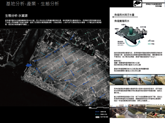 我們透過四個(gè)面對(duì)我們的基地進(jìn)行分析,分別是人文、產(chǎn)業(yè)、環(huán)境還有災(zāi)害的部分,進(jìn)入我們的分析,從土地利用分析我們可以看到大區(qū)塊的養(yǎng)殖用地,排出其他用地的可能性,更造成共用空間的稀少,甚至我們可以看到聚落更在海岸的前線,造成居民生命的危險(xiǎn)。從水資源來看,我們可以看到水泥化的魚塭其實(shí)對(duì)地下水的大量需求,以及魚塭本身廢水未經(jīng)過處理就排放,造成當(dāng)?shù)氐乃廴緡?yán)重以及嚴(yán)重的地沉下陷。