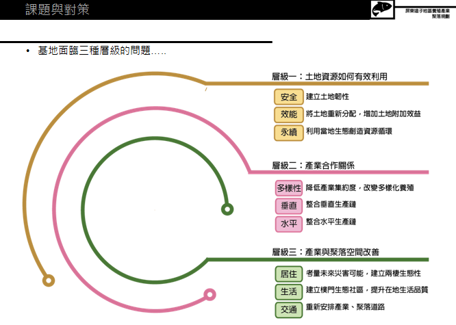 為了營運(yùn)三個(gè)層級(jí)我們發(fā)展出了四個(gè)步驟,第一步驟是來自于地權(quán)的重新分配,考慮將過去單一的土地利用做多元復(fù)合的形態(tài);第二則是深入研究目前運(yùn)作方式的缺點(diǎn),期望把它做一個(gè)改變;第三則是在產(chǎn)業(yè)完成之后去考慮讓它如何跟周邊的聚落和生活做一個(gè)結(jié)合;第四則是期望最終它達(dá)到一個(gè)永續(xù)產(chǎn)業(yè)地景的形態(tài),讓它變成一個(gè)不再邁入死亡,而是邁入地景的升級(jí)。