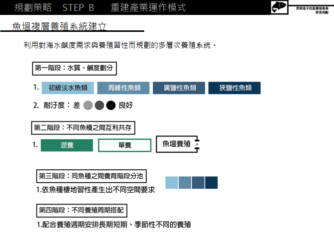 剛剛四項(xiàng)的技能配比其實(shí)它發(fā)展出的是一個(gè)水文單元的模具,其實(shí)這樣的單元模具就是建立成一個(gè)養(yǎng)殖系統(tǒng),未來我們就是期望我們借由水文的設(shè)計(jì)跟水量的控管,達(dá)到不同分區(qū)水文系統(tǒng)區(qū)塊,讓它每一個(gè)區(qū)塊成為一個(gè)循環(huán)的系統(tǒng),最后這樣一個(gè)魚塭地景不再只是冷冰冰的水泥區(qū)塊,而是富含生機(jī),甚至它創(chuàng)造了很多產(chǎn)業(yè)的多元性,以及降低了剛剛說的單一化產(chǎn)業(yè)上造成的風(fēng)險(xiǎn),甚至結(jié)合成為一個(gè)有韌性的生活形態(tài)。