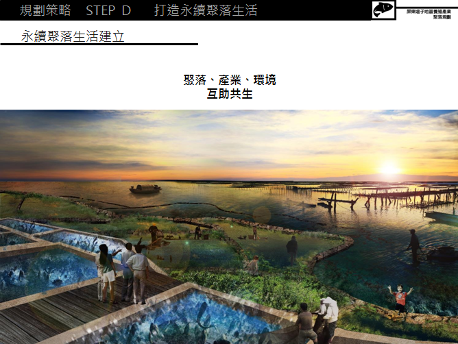 上面所說的包含的是在步驟B的一個(gè)討論,我們期望的是在產(chǎn)業(yè)完成之后我們?cè)趺礃尤ビ懻撨@樣一個(gè)產(chǎn)業(yè)跟生活的結(jié)合,所以我們其實(shí)提了一個(gè)小區(qū)塊的生活構(gòu)想。它的內(nèi)里含了一個(gè)像魚菜共生和社區(qū)共同生活的概念,其中主要的是小農(nóng)社區(qū)、小漁社區(qū)以及社區(qū)共享,這樣一個(gè)軟性的設(shè)計(jì)不再只是我們大型開發(fā)的區(qū)塊,而是以生活的想象去思考我們到底要如何在這樣的景觀下生存,不同的行業(yè),不同的人們之間有什么結(jié)合的可能性。