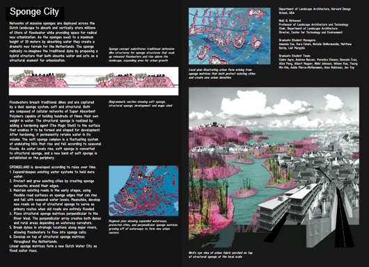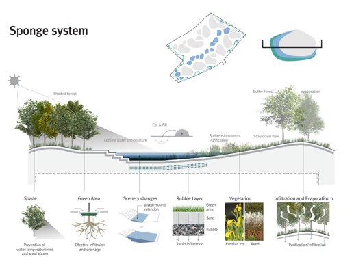 海綿從根本上重新想象和定義了傳統的堤壩,它提供了一個既能吸收水,也能作為城市結構元素的一個混合結構。洪水是被雙海綿系統所攔截,包括柔軟的系統以及結構化的系統。兩者皆由土壤和高吸水性的聚合物混合而成,就像圖中所示,他們能夠容納重量數百余灘的水。你們都是很熟悉的它是尿不濕的成分,柔軟海綿是一個綿綿起伏的系統,隨著季節性的洪水上升和下降的,當平均水位上升時,柔軟海綿通過加入硬化劑轉化為結構海綿,并在表面形成一個硬核用于開發。整個項目被命名為海綿城市,在2005年表達其吸收的性質以及作為允許未來發展的基礎設施的性質。