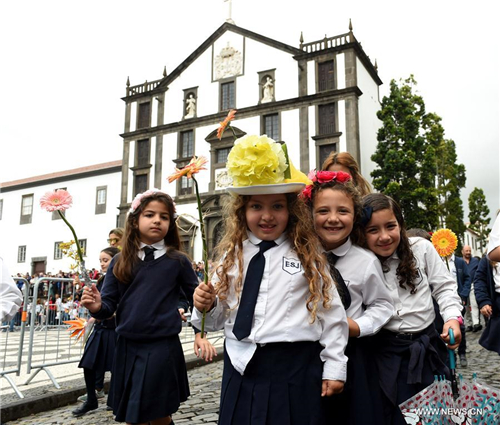 5月6日,在葡萄牙馬德拉自治區首府豐沙爾,人們向市政廣場行進。當日,葡萄牙馬德拉鮮花節進入第二天。孩子們在豐沙爾市政廣場用鮮花搭建“希望之墻”,祈愿更加和平與美好的未來。