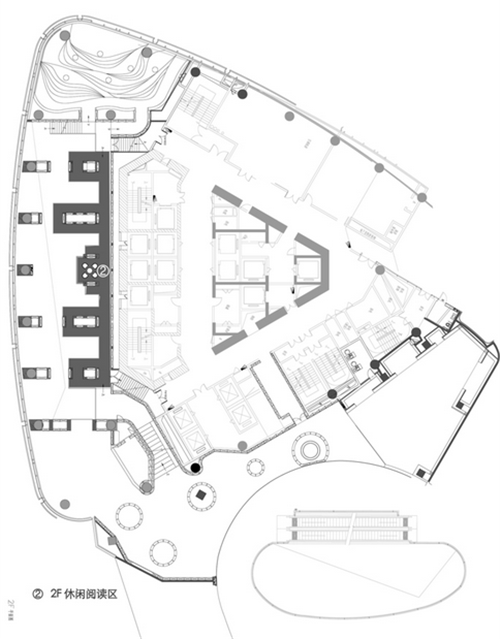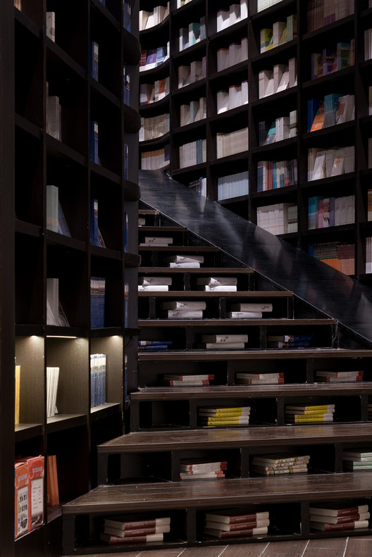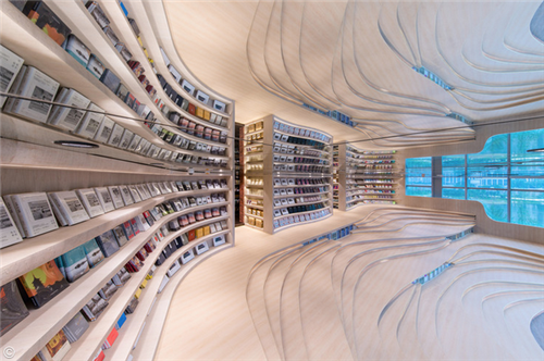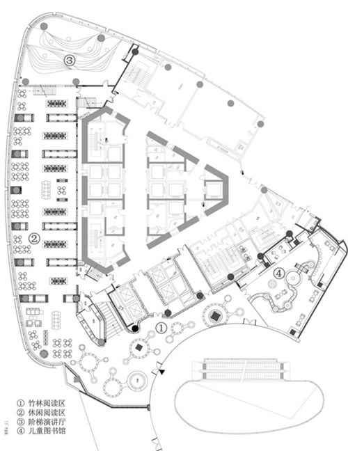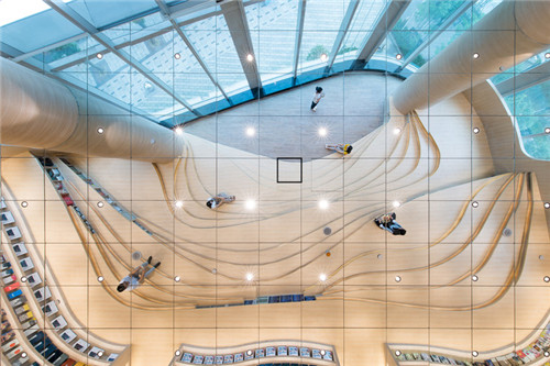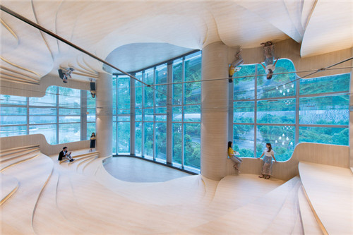 走過"城區"端頭,登上一步書籍樓梯,便來到了演講廳。一條條看似隨意的線條組成了高低錯落的階梯,可行亦可坐。在鏡面天花的反射下,組合成一個上下映襯的"梯田",在這里可以聽上一場啟迪心靈的講座,抑或是一個引人深思的話劇。