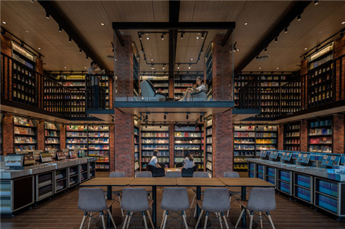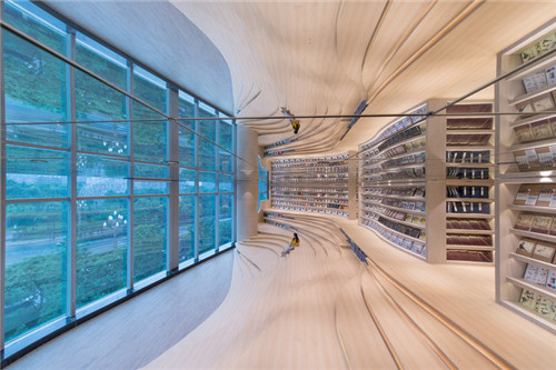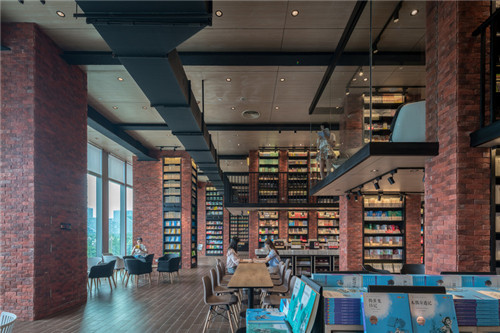 "竹林"左側,隱約可見的紅色磚墻,便是此間鐘書閣最具特色的地方。通高5米的空間,紅色磚墻一砌到頂,圍合成一個個獨立的小城區,空中一條步行棧道穿插著其中,時而繞墻而行,時而穿門而去。只為偶遇某一本心儀的書籍,盡情的徜徉在小小的城區中。全落地窗旁散落著可供休息的座椅,在午后溫暖的陽光下,品上一杯茶,讀著心儀的書籍,此生愜意溢于言表。