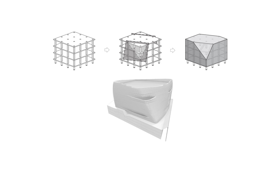 這些建筑的組織布局全都需要一個公共基座,支撐展覽空間的黑色盒式結構和實物大小的模型。這個模型住宅展館的設計是使黑色抹灰盒式結構坐落在一個動態的玻璃底座之上。透明的底座展示了建筑內的活動,同時創造了一個可以欣賞公園景色的封閉公共空間。