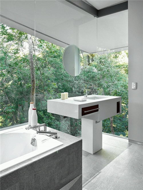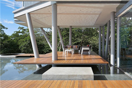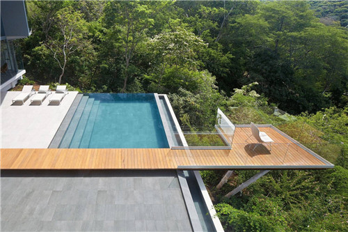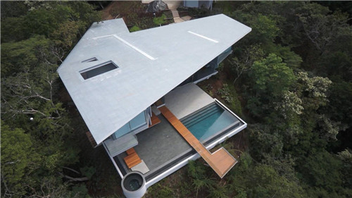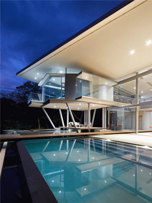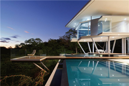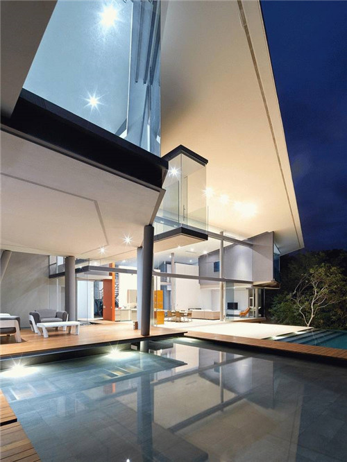 房子的前面是一個懸空的泳池,而泳池上面又是一個懸空式的觀景臺,觀景臺仿佛一個脫離了主體建筑的獨立結構,這樣,使得建筑擁有了更美妙的觀景視野,獨特的設計讓整個別墅有了無以倫比的詩意享受。