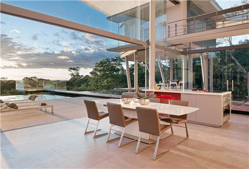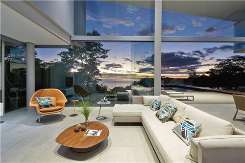 別墅根據特殊的地勢而建,背山朝海,建筑師采用大面積的透明玻璃作為主要的空間分割,將自然景色引入室內,大飄蓬的屋頂起到了很好的遮陽作用,整個設計展現出了設計師對自然環境細致的關懷。
