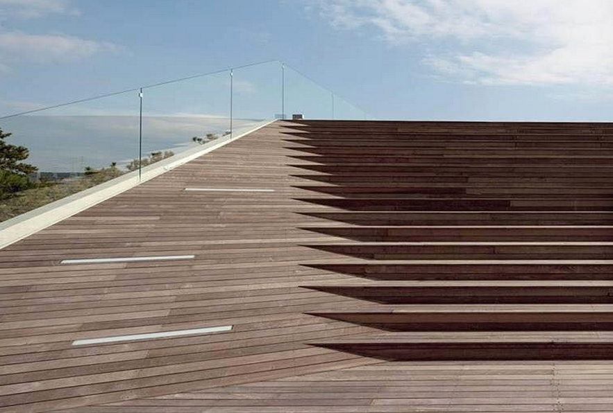 為了讓人們可以在建筑內獲得最佳的觀景視野,建筑師將面向大海和沙灘的開口長度最大化,且根據給定的容積率將中央部分留空,座椅沿建筑邊緣設置,以讓更多人能夠享受優美的景色。建筑中,高度不同的長條形連續空間相互疊加,其間通過連橋連接;坐席被設置在圍繞中央空洞盤旋而上的寬闊長廊上,讓使用者可以盡享海景以及其他自然界的豐富景觀。