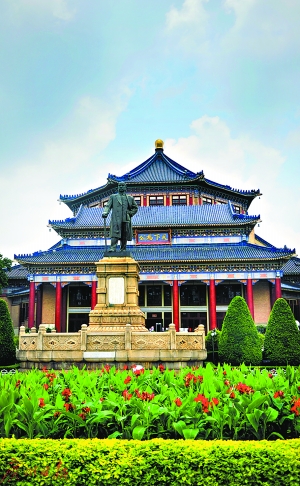 廣州市中山紀念堂是廣州人民和海外華僑為紀念孫中山先生集資興建的。1929年1月動工,1931年11月建成。1956年,重鑄的5米高的孫中山先生銅像屹立在紀念堂前。1963年對紀念堂進行了大規(guī)模翻修,屋頂全部采用藍色琉璃瓦。這座八角形建筑,外形莊嚴宏偉,設計師巧妙運用了建筑力學的結構原理,采用鋼架和鋼筋混凝土混合結構,跨度達71米的建筑空間內(nèi)不設一柱。
