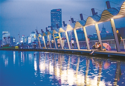 除了夜間景觀打造,槐樹路市政綠化改造的部分設(shè)計也十分人性化。改造后的濱江游步道分成自行車道、濱江步道和綠化帶三道,“通車、通行、通綠化”的三通理念應用得淋漓盡致。項目新增綠化約2萬平方米,更新廣場鋪裝近2萬平方米,同時進行了人行道鋪設(shè)、景觀小品提升及其他配套工程,如綠化帶上加設(shè)、加固了部分無障礙通道功能、非機動車停放區(qū)域和便民娛樂設(shè)施,以滿足多種不同需要。