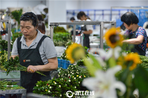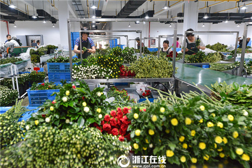 紹興市柯橋區平水鎮海豐花卉種植加工出口基地,宛如一個超級農貿市場,200多名工人正在有條不紊地進行選花、切葉、打把、分選、養水,流水線作業包裝出口日本的新鮮菊花。
