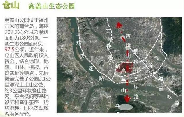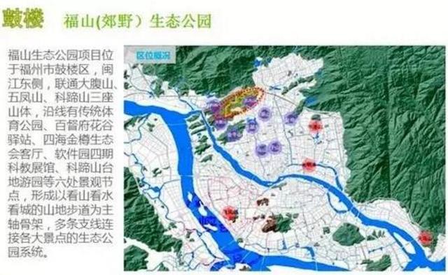 位于閩江東側,聯通大腹山、五鳳山、科蹄山三座山體,總規劃面積達到100公頃。春節前,計劃建成生態公園22.5公頃,新增步道約5公里。