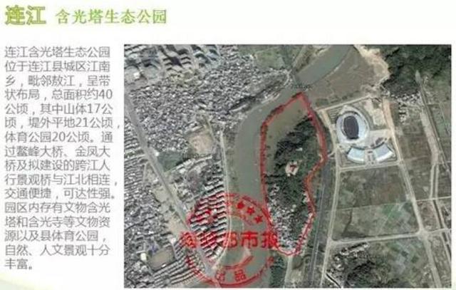 毗鄰敖江,呈帶狀布局,總面積約38公頃。園區內存有文物含光塔和含光寺等文物資源以及縣體育公園,自然、人文景觀十分豐富。